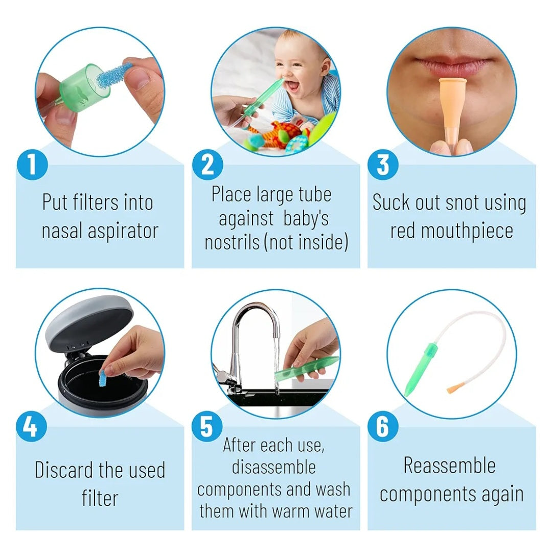 This nasal aspirator comes with a transparent design that allows you to see the mucus, ensuring thorough cleaning. It can be easily taken apart for washing and includes 24 extra hygiene filters to maintain cleanliness.