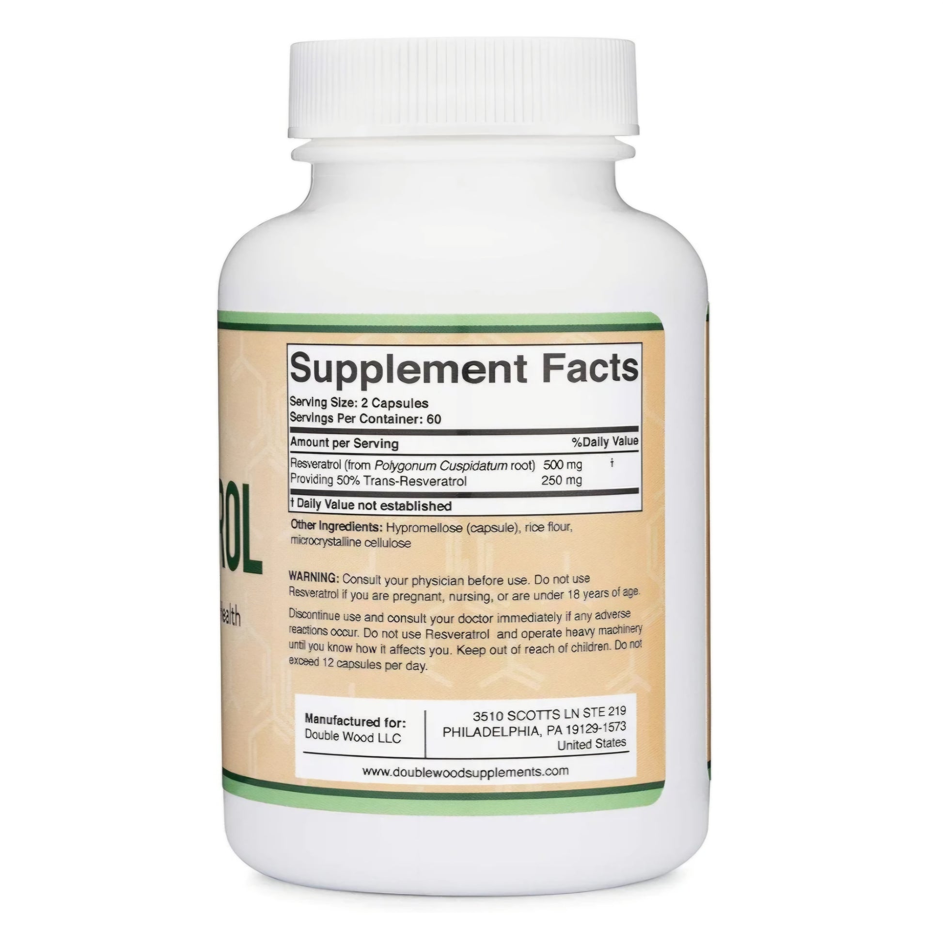 VEGETARIAN SAFE RESVERATROL: Double Wood's Resveratrol is a plant extract and is made with veggie capsules to be 100% Vegetarian friendly