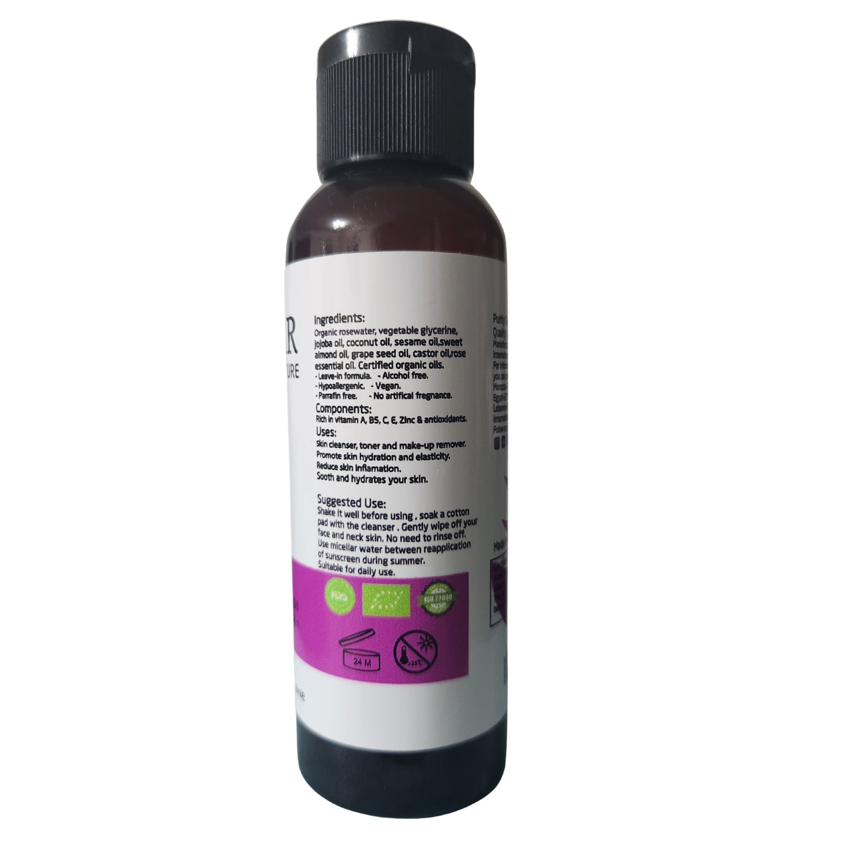 Made with certified organic ingredients like rosewater, jojoba oil, coconut oil, and castor oil, this formula nourishes your skin while providing a refreshing cleanse. Perfect for all skin types, especially dry and sensitive skin.