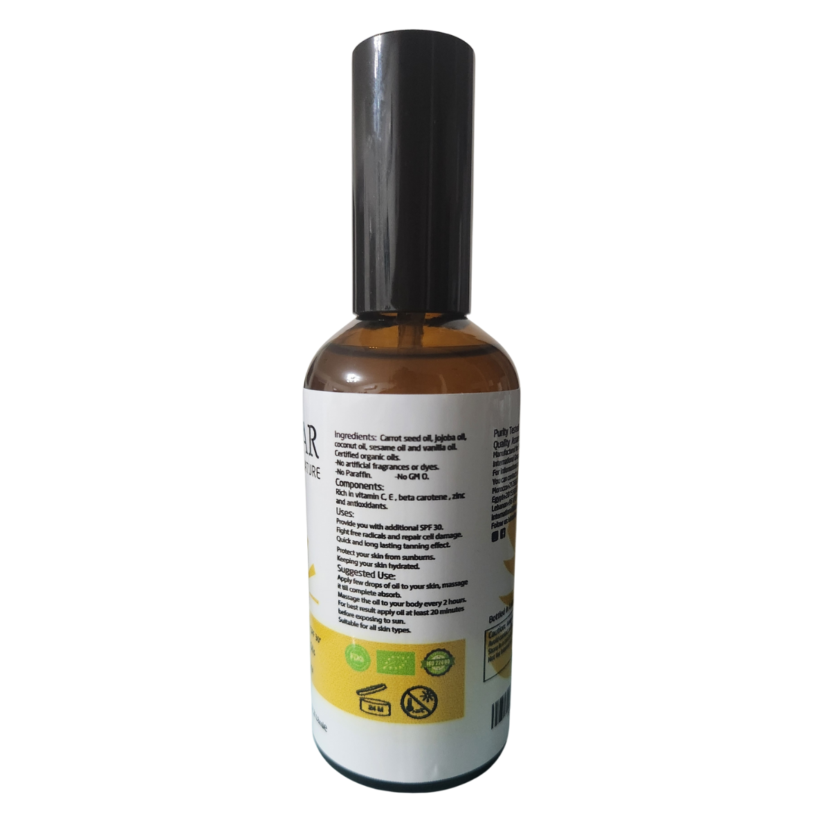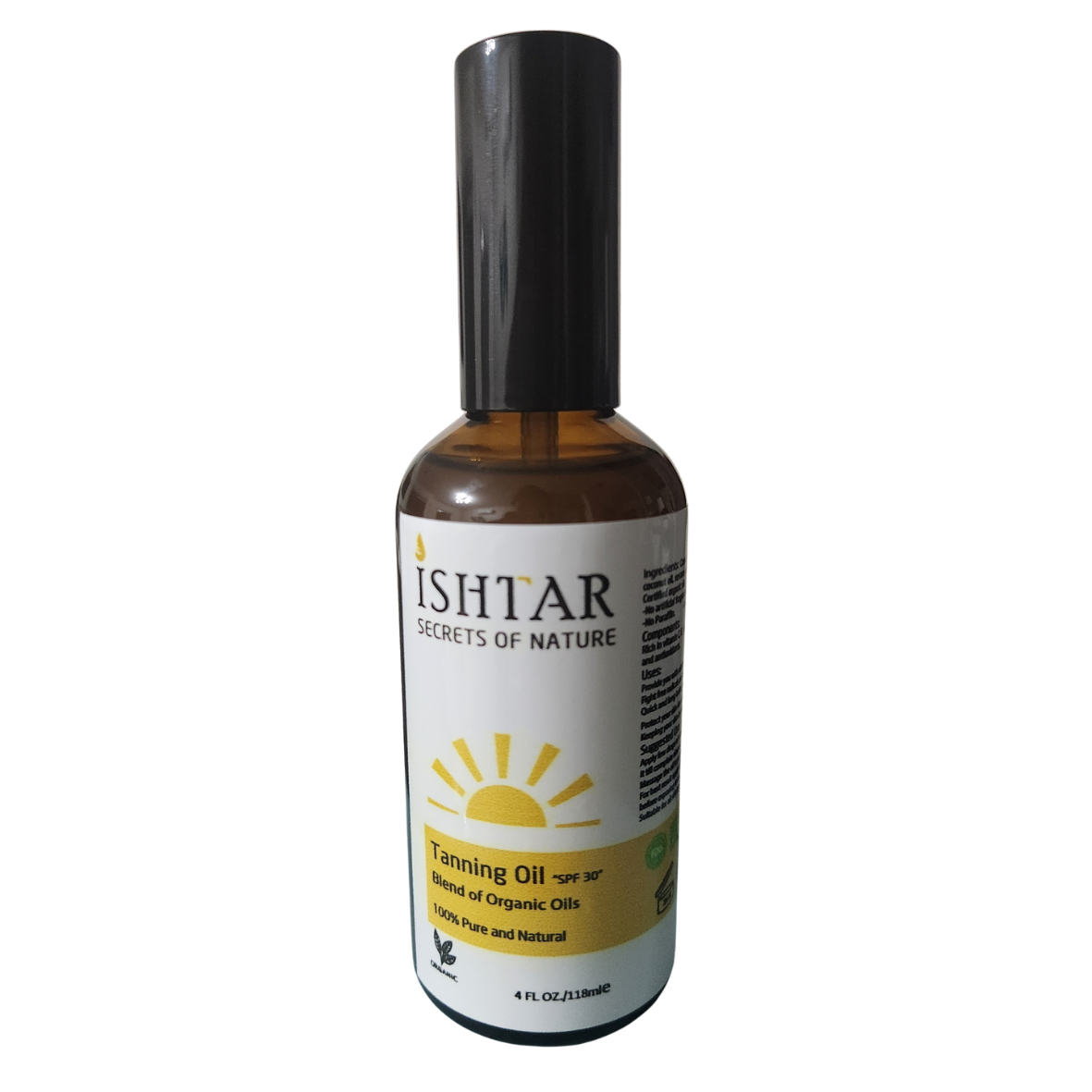 Get a sun-kissed glow while nourishing your skin with Ishtar Tanning Oil SPF 30. This luxurious blend of 100% pure and natural, certified organic oils protects your skin and enhances your tan naturally. Formulated with carrot seed oil, jojoba oil, coconut oil, sesame oil, and vanilla oil, it deeply hydrates and leaves a subtle, natural scent without any artificial fragrances or dyes.