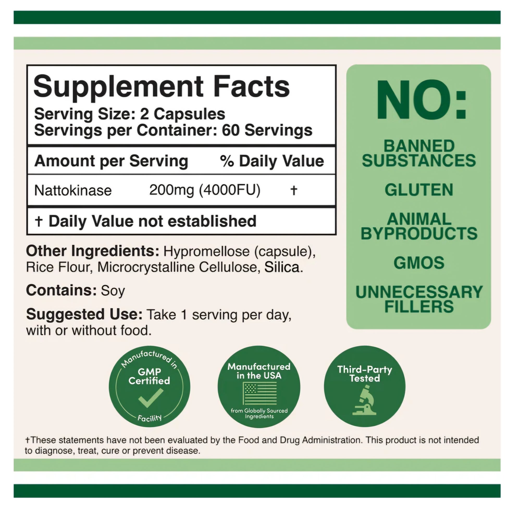 TWO-MONTH SUPPLY: Our Nattokinase supplement contains 60 servings of 200 mg (4,000 FU), which equals 120 capsules (100 mg, 2,000 FU per capsule)