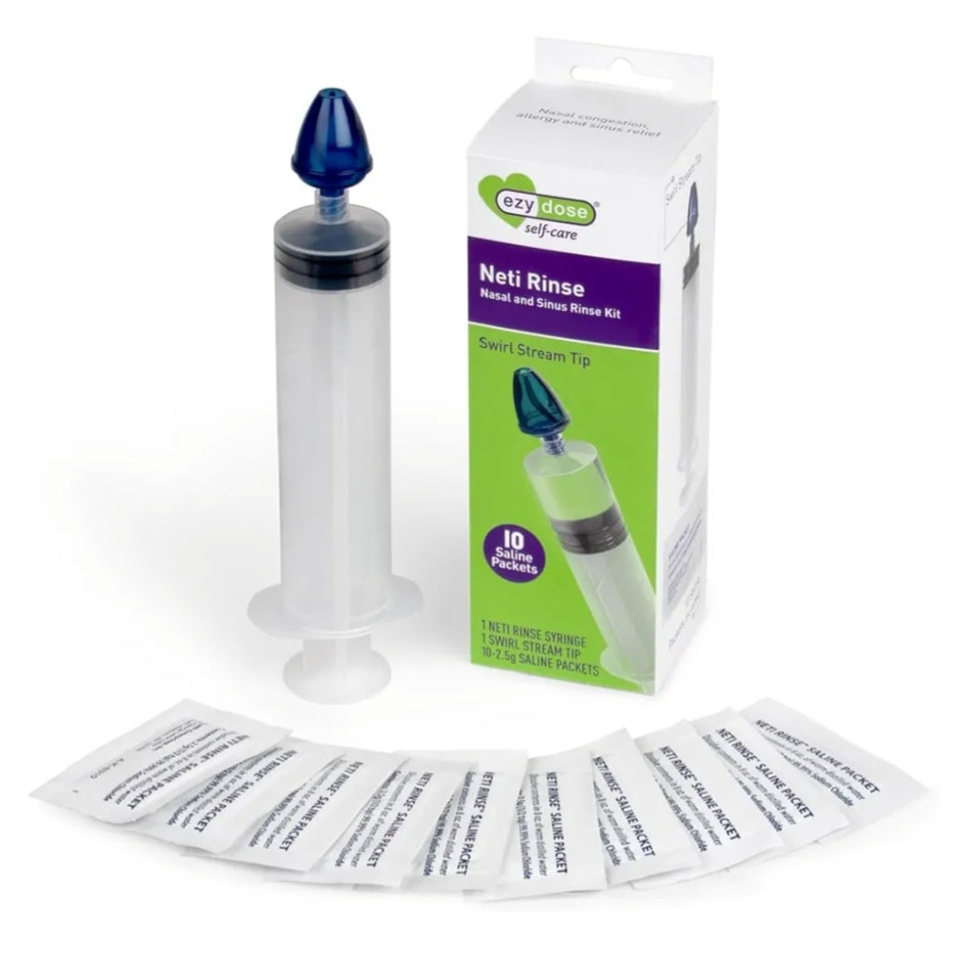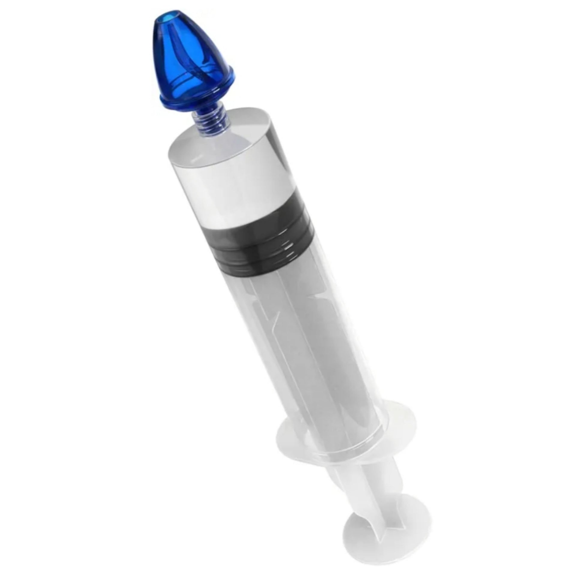 Easily fill syringe with saline rinse solution and use one complete syringe per nostril