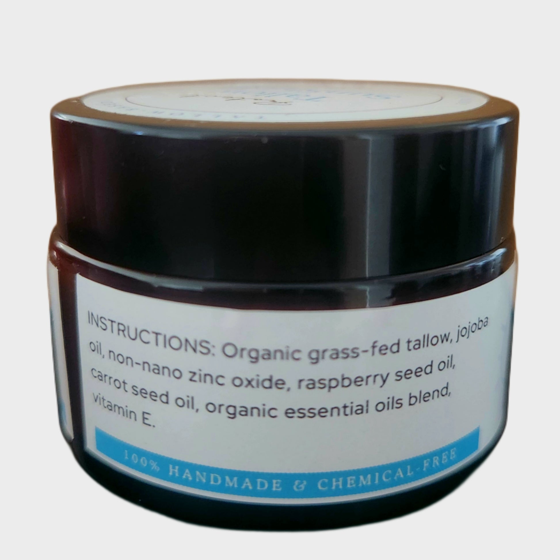 Protect your skin the natural way with Tallow SunShield by New Biology Wellness — a tallow-based, all-natural sunscreen handcrafted with care. Formulated with organic grass-fed tallow, non-nano zinc oxide, raspberry seed oil, jojoba oil, carrot seed oil, and a nourishing blend of organic essential oils and vitamin E, this chemical-free formula offers gentle yet effective protection from harmful UV rays.