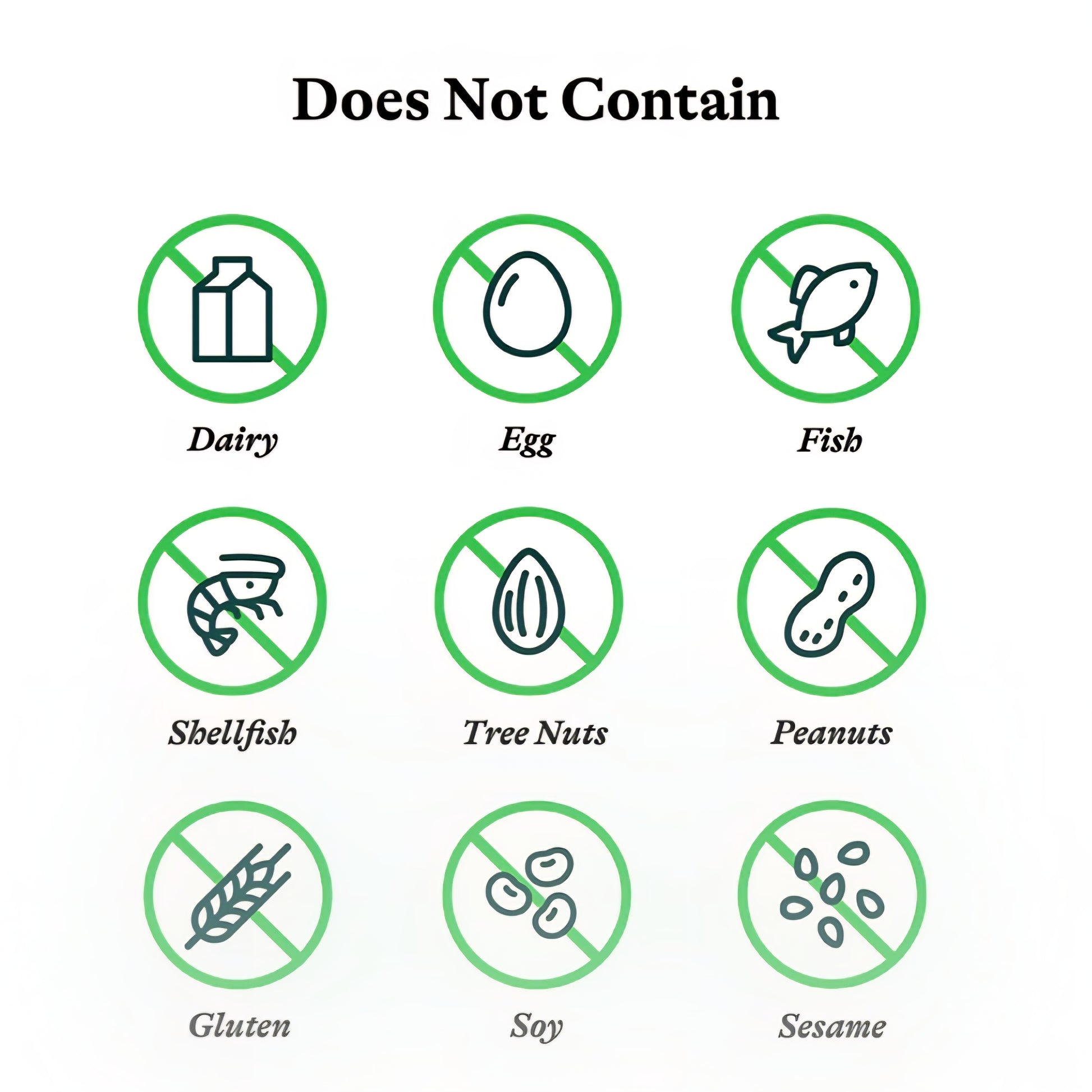 Does not contain: Dairy, eggs, fish, shellfish, tree nuts, peanuts, wheat, soy, sesame, gluten, GMO, artificial colors, or artificial flavors.